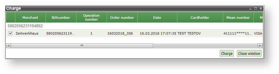 After pressing 'Charge' button the 'Result' column will show the results of confirmation for each bill which was selected. In case of failure the corresponding error message is displayed in the 'Result' field.