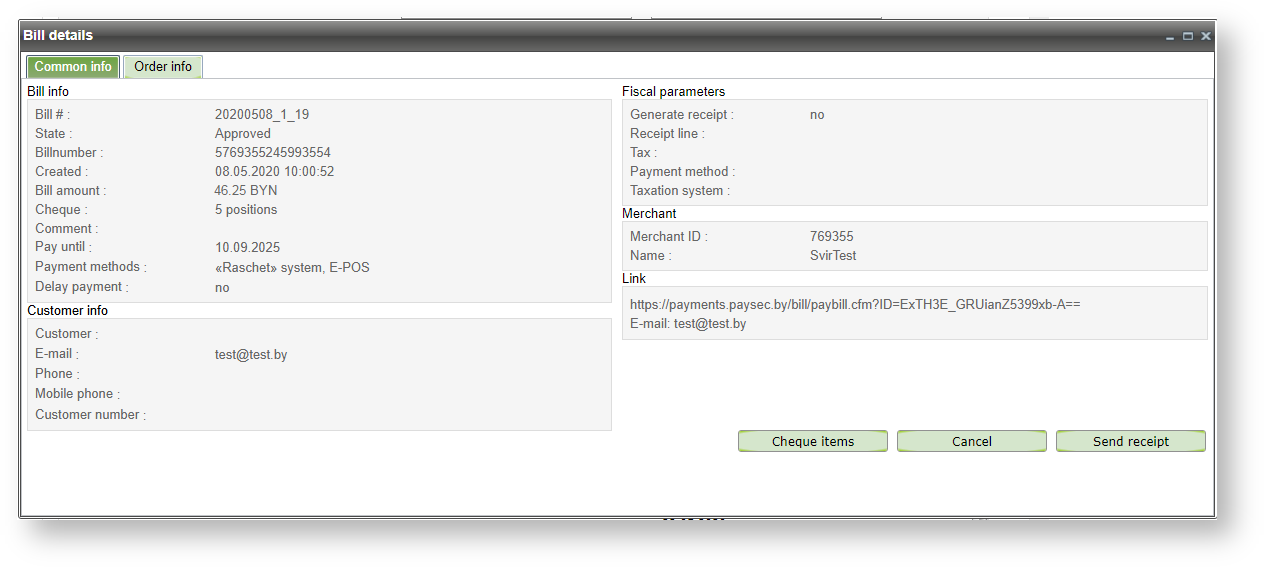 If the bill has been paid and is in one of the following states – In Payment , Approved , Canceled , Partial Canceled , Deleted then the Bill details window will have two tabs: 'Common info ' and ' Order Info '.
