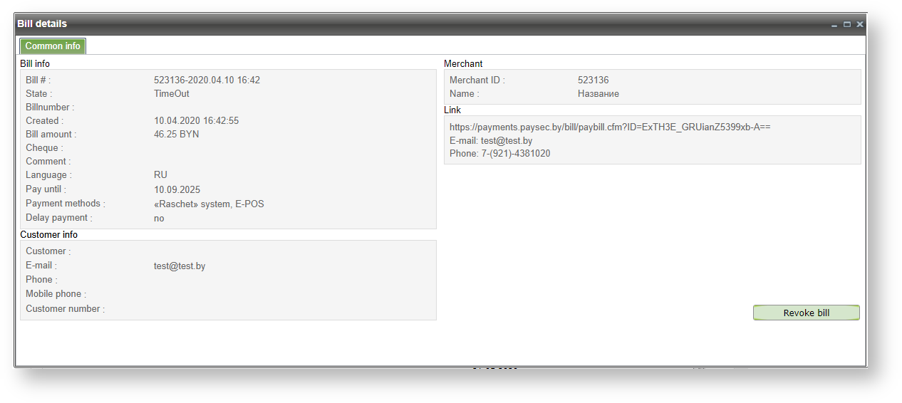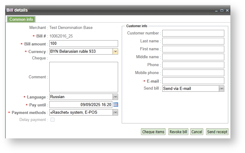 All parameters that have already been entered by creation a bill are automatically displayed in the «Pay» window and can not be edited.