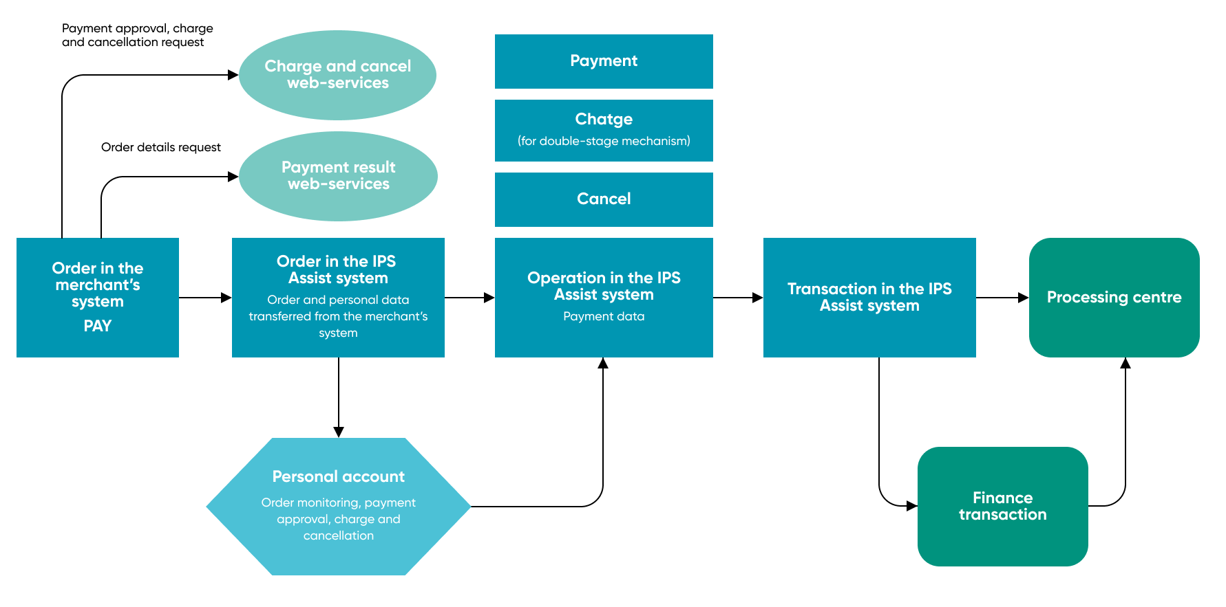 - The transaction is being created in the IPS Assist after receiving and defining all payment details. The created transaction is being sent to the processing center. Depending on the replay from the processing center (successfully or not the authorization has passed) the transaction, the operation and the order in the IPS Assist change their status. After successful payment operation the order status became «Approved». There can be only one successful payment operation in the order.