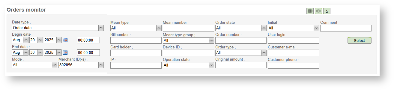 The various filters are available to use in Orders monitor. You can change the set of the displayed filters using the filters settings button, located to the right in the upper part of the Orders monitor window.