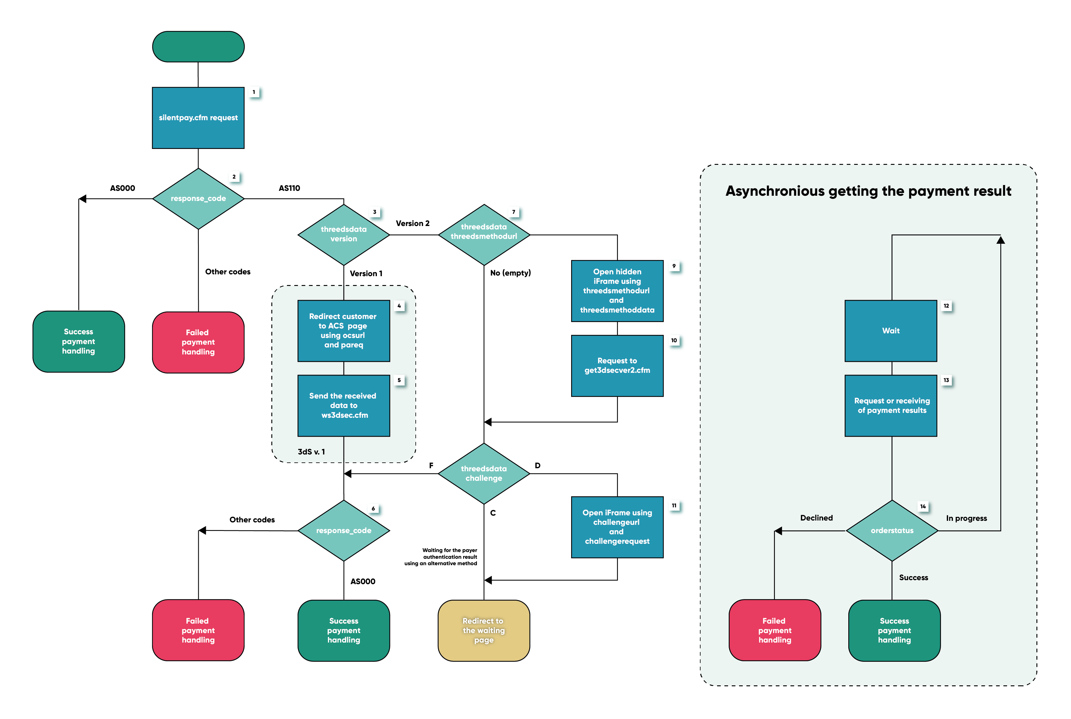 Receipt of the payment result after additional verification is reflected in the diagram in blocks 12, 13, 14.