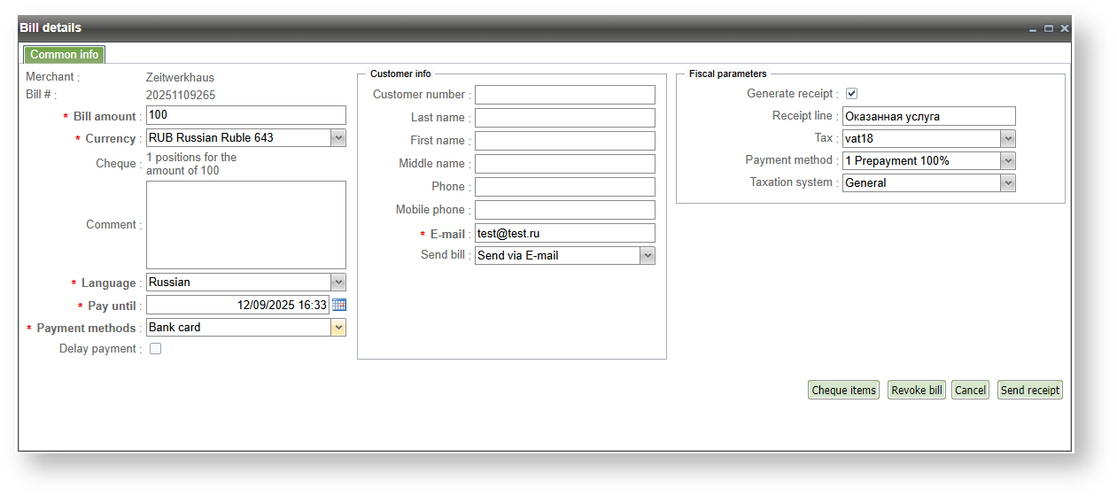 All parameters that have already been entered by creation a bill are automatically displayed in the «Pay» window and can not be edited.
