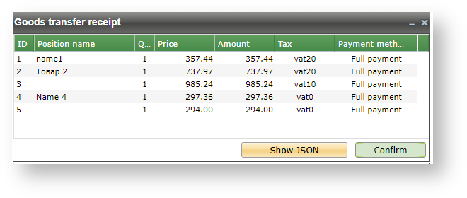 View of receipt for the goods transfer in JSON format
