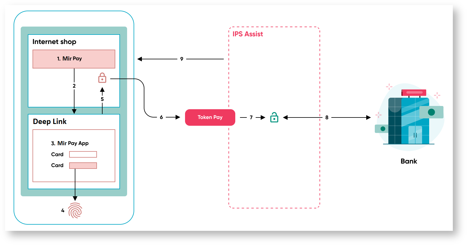 - Mir Pay app creates an encrypted package with a token and payment data and returns it to the IPS Assist.