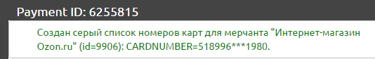 The result of pressing one of the buttons displayed at the top of the payment details window:: | · Blocked – the number of mean of payment and E-mail address are being added to the "black" lists, and if these values were presented in the corresponding "white" lists, they are become inactive there; the user ID is added to the domain filter. ID пользователя добавляется в доменный фильтр. · Checked - the number of mean of payment and E-mail address are being added to the "grey" lists, and if these values were presented in the corresponding "white" or "black" lists, they are become inactive there; the user ID is become inactive in the domain filter, if this value was presented there. · Trusted - the number of mean of payment and E-mail address are being added to the "white" lists, and if these values were presented in the corresponding «grey» or "black" lists, they are become inactive there. |
