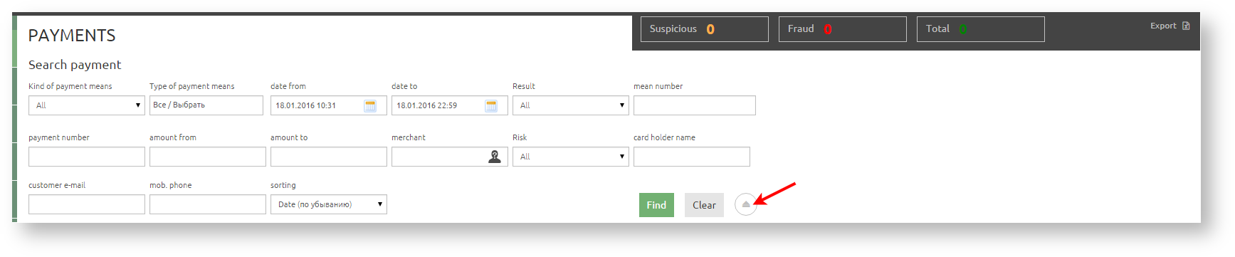 The buttons in upper part of the screen displays numbers of fraudulent and suspicious payments after preparing of request results in accordance with the search filter.