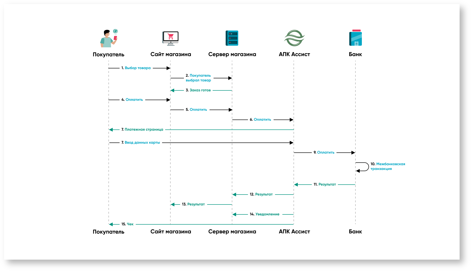 - АПК Ассист проводит авторизацию (оплату) в банке-эквайере.