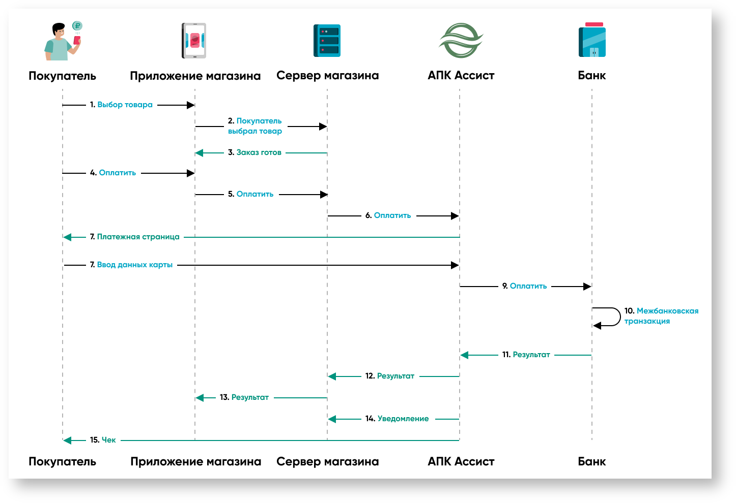 - АПК Ассист проводит авторизацию (оплату) в банке-эквайере.