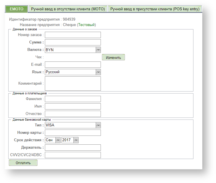 4.Теперь необходимо заполнить поля экранной формы для проведения платежа. Подтверждение внесенных данных осуществляется с помощью кнопки «Оплатить».
