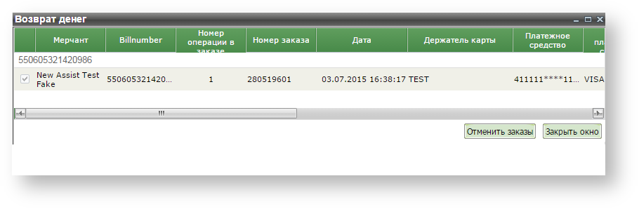 Выбор пункта «Отменить оплату» контекстного меню вызывает открытие нового окна «Возврат денег» с кнопками «Отменить заказы» и «Закрыть окно».