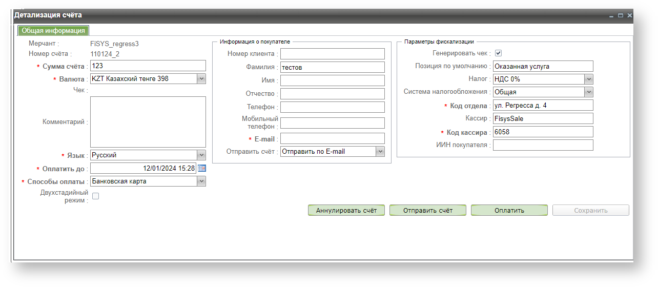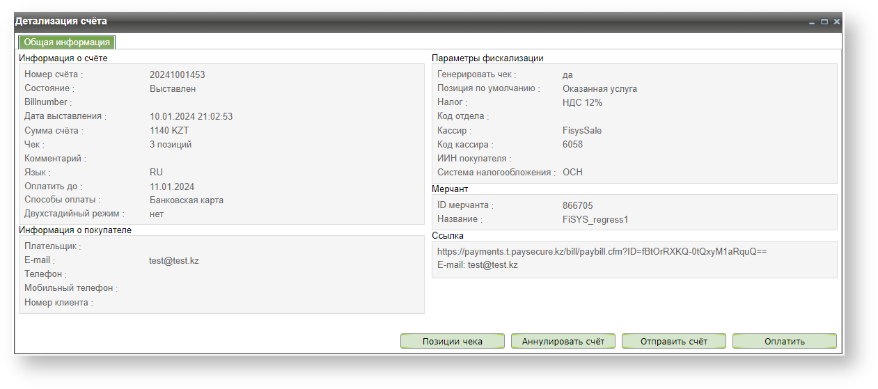 Если счет уже был оплачен и находится в состояниях В оплате, Оплачен, Отменен, Отменен частично, Удален, то окно детализации счета будет иметь две вкладки: «Общая информация» и «Информация о заказе».