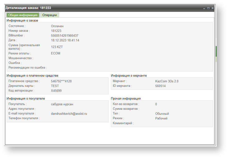 В детализации заказа также имеется вкладка «Операции», на которой отображаются все операции по данному заказу.