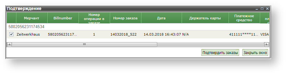 После нажатия кнопки «Подтвердить заказы» в колонке «Результат» отображается результат для каждого заказа, по которому производилось снятие денежных средств. В случае неуспеха отображается соответствующая ошибка.