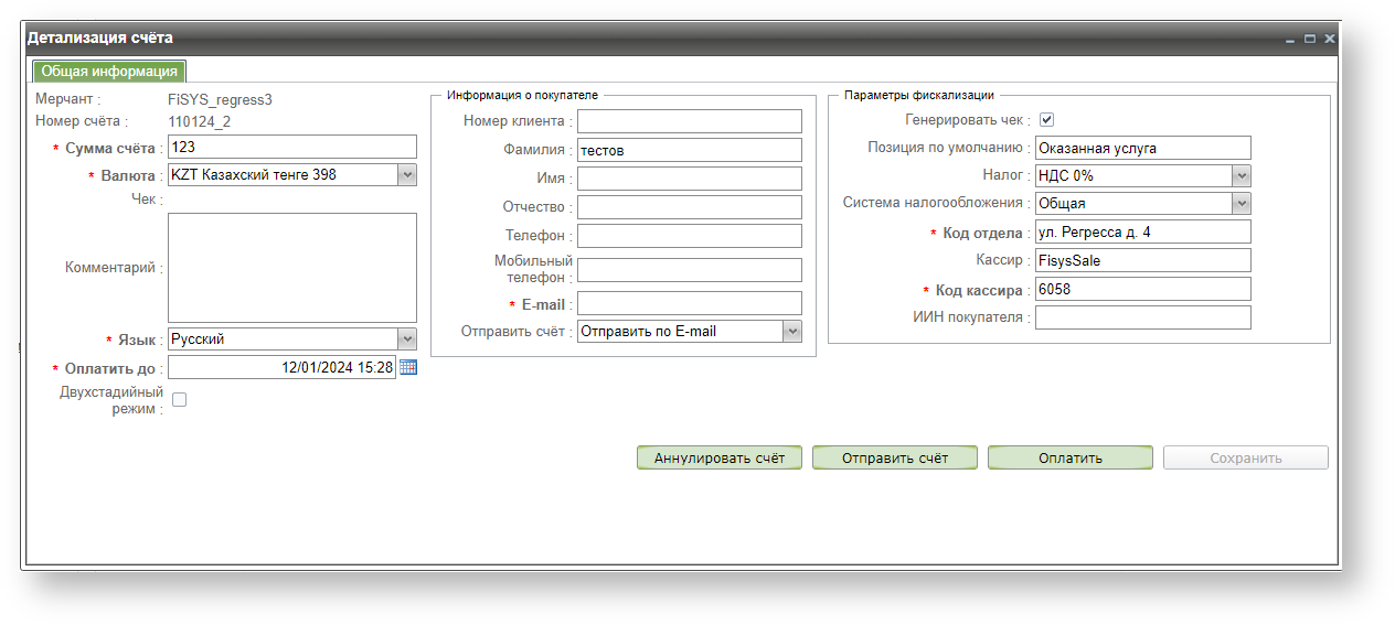 Если счет уже был оплачен и находится в состояниях В оплате, Оплачен, Отменен, Отменен частично, Удален, то окно детализации счета будет иметь две вкладки: «Общая информация» и «Информация о заказе».