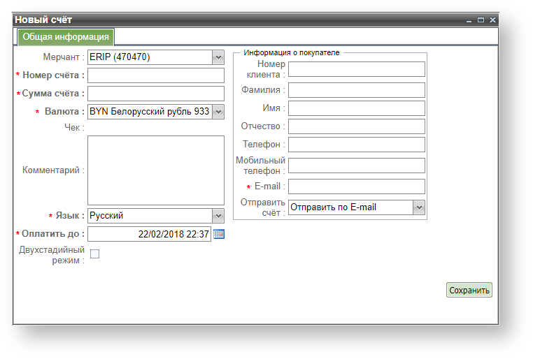 Отдельная кнопка «Новый счет» позволяет оператору создать счет прямо из личного кабинета. После нажатия этой кнопки открывается новое окно для создания счета. Обязательные параметры отмечены звездочками.