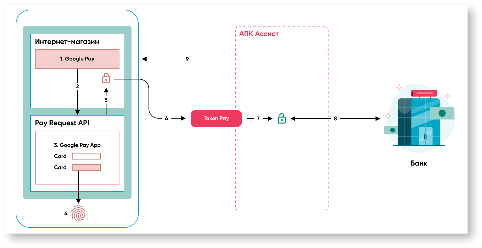 - Приложение Google Pay формирует зашифрованный пакет с токеном и данными платежа и возвращает его в АПК Ассист.