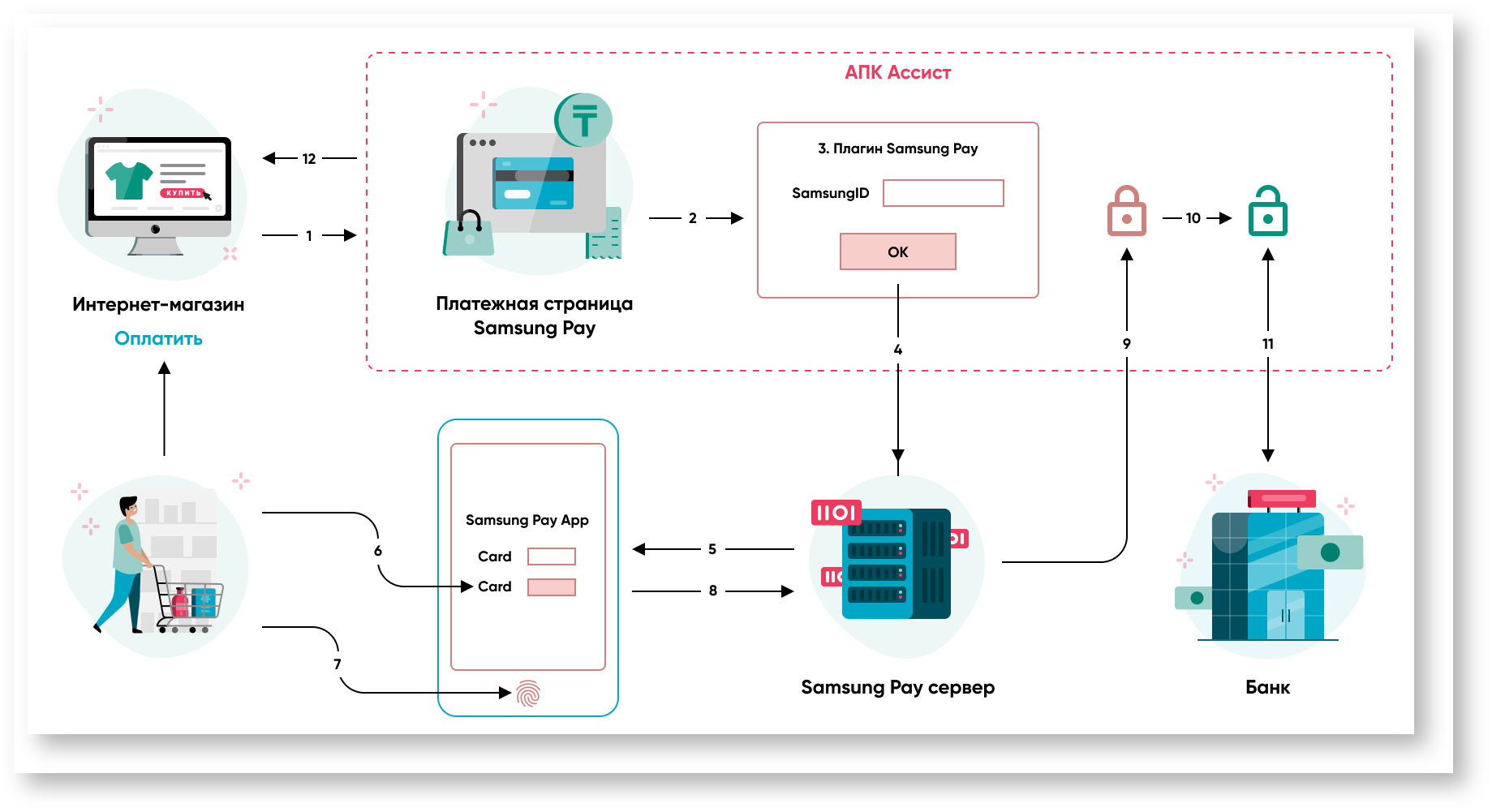- АПК Ассист получает от сервера Samsung Pay шифрованный пакет с токеном и данными платежа.