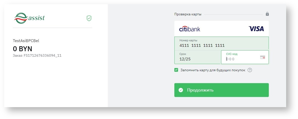 При выполнении операции ASI на платежной странице для покупателя будет отображаться заголовок Проверка карты, нулевая сумма платежа и кнопка Продолжить, вместо кнопки Оплатить.