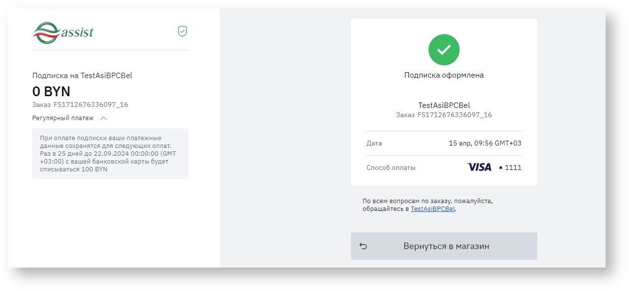 Внешний вид платежной страницы для операции ASI (оформление подписки)