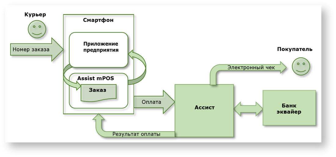 Мобильное приложение Assist mPOS может использоваться по-разному в зависимости от технологии работы курьерской службы (мобильного офиса). В приложении Assist mPOS возможны три варианта получения данных заказа для оплаты доставленного курьером заказа или товара (услуги) в мобильном офисе.