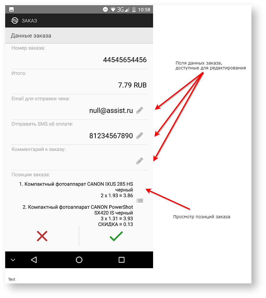 Если номер заказа введен правильно, то полученные от информационной системы компании-продавца или курьерской службы данные заказа - Email адрес покупателя, его телефон и список оплачиваемых товаров отобразятся на экране приложения:
