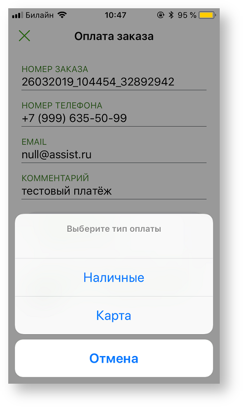 Перед оплатой необходимо выбрать способ оплаты заказа – наличными или картой.