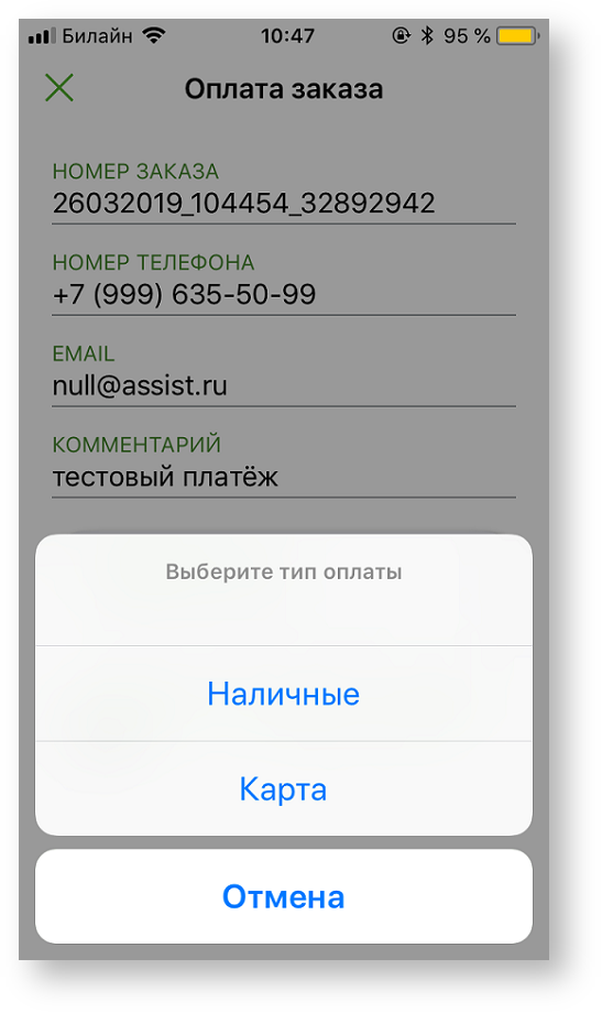 Перед оплатой необходимо выбрать способ оплаты заказа – наличными или картой.