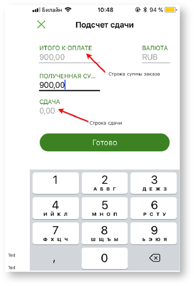 При выборе оплаты наличными для удобства пользователя осуществляется подсчет сдачи.