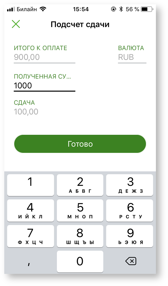 При выборе оплаты наличными для удобства пользователя осуществляется подсчет сдачи.