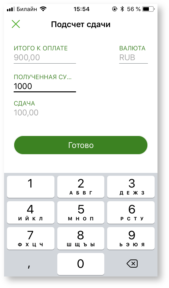 Выбор кнопки «Готово» закрывает окно подсчета сдачи.