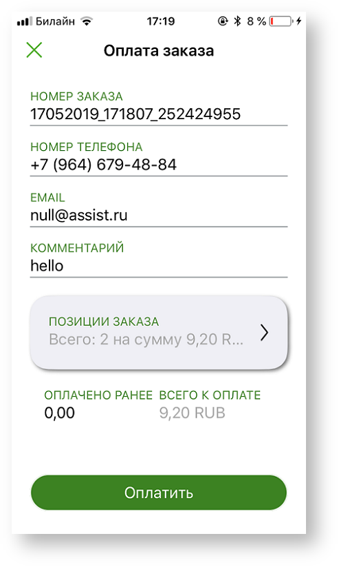 Далее отображается результирующий экран платежа.