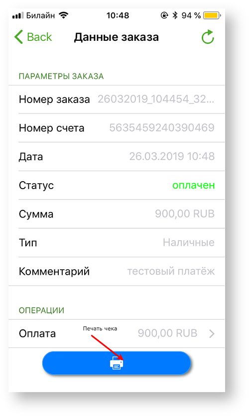 При наличии подключенного принтера можно распечатать чек об оплате. Подключение принтера описано в разделе "Подключение принтера"