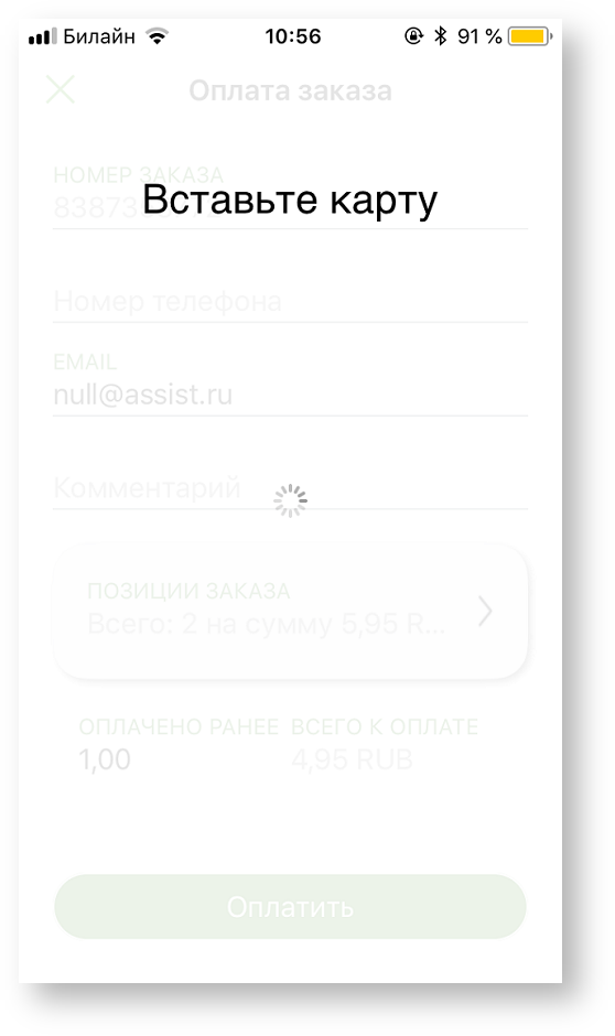 Далее покупателю предлагается вставить карту в беспроводной терминал (терминал принимает данные карты с помощью одного из возможных способов - NFC, чип, магнитная полоса):