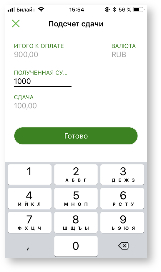 Выбор кнопки «Готово» закрывает окно подсчета сдачи.