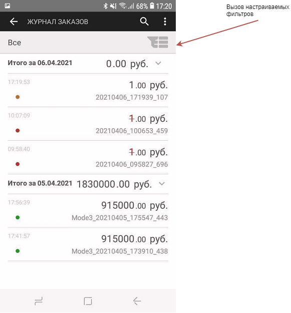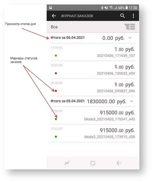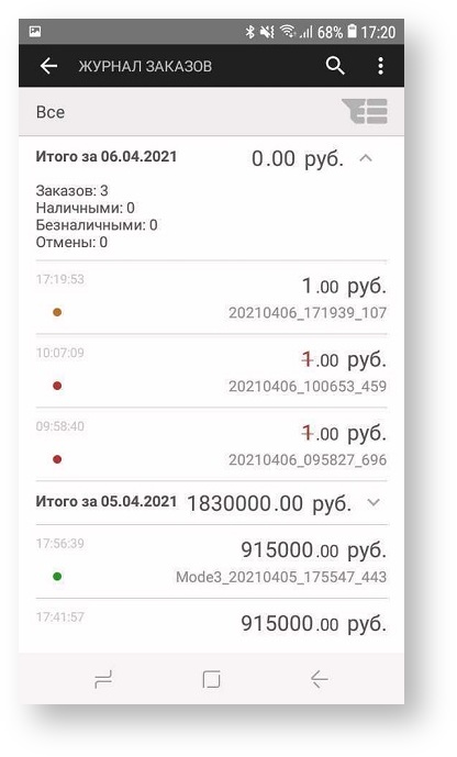 В журнале заказов можно в любой момент просмотреть результат работы приложения mPOS за текущий день. Для просмотра итогов следует нажать на кнопку «Итого за <ДАТА>», после чего отобразится итог за день в виде выпадающего списка значений:
