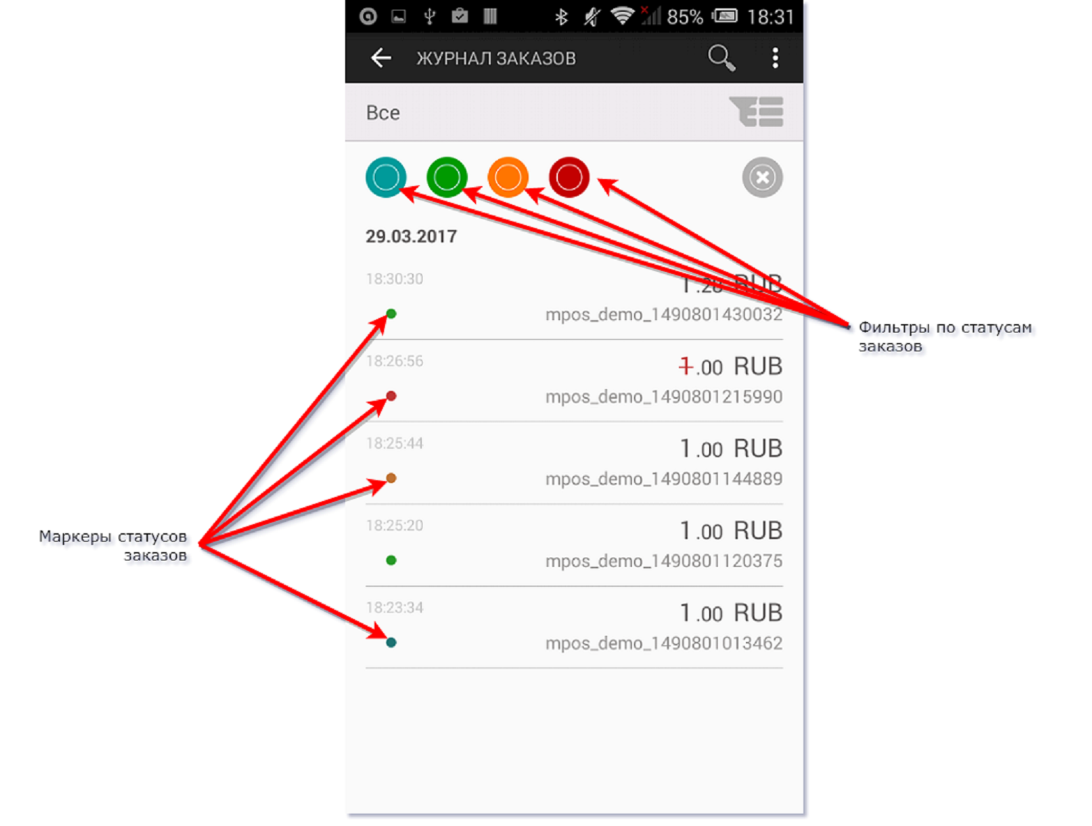 В приложении Assist mPOS сохраняется журнал заказов, в котором можно получить информацию обо всех заказах, проведенных на этом устройстве. Журнал заказов можно открыть, выбрав просмотр журнала заказов после открытия приложения. Если для данного пользователя Assist mPOS настроена работа с несколькими магазинами, то для каждого магазина сохраняется отдельный журнал заказов.