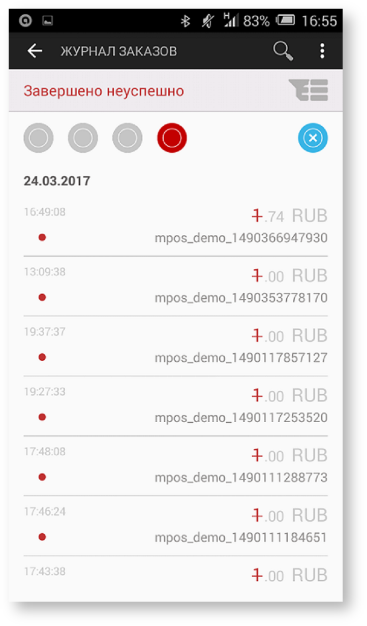 • красный - неуспешная оплата по заказу (платеж отклонен);