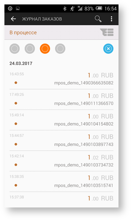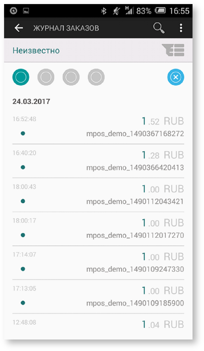 В приложении Assist mPOS сохраняется журнал заказов, в котором можно получить информацию обо всех заказах, проведенных на этом устройстве. Журнал заказов можно открыть, выбрав просмотр журнала заказов после открытия приложения. Если для данного пользователя Assist mPOS настроена работа с несколькими магазинами, то для каждого магазина сохраняется отдельный журнал заказов.
