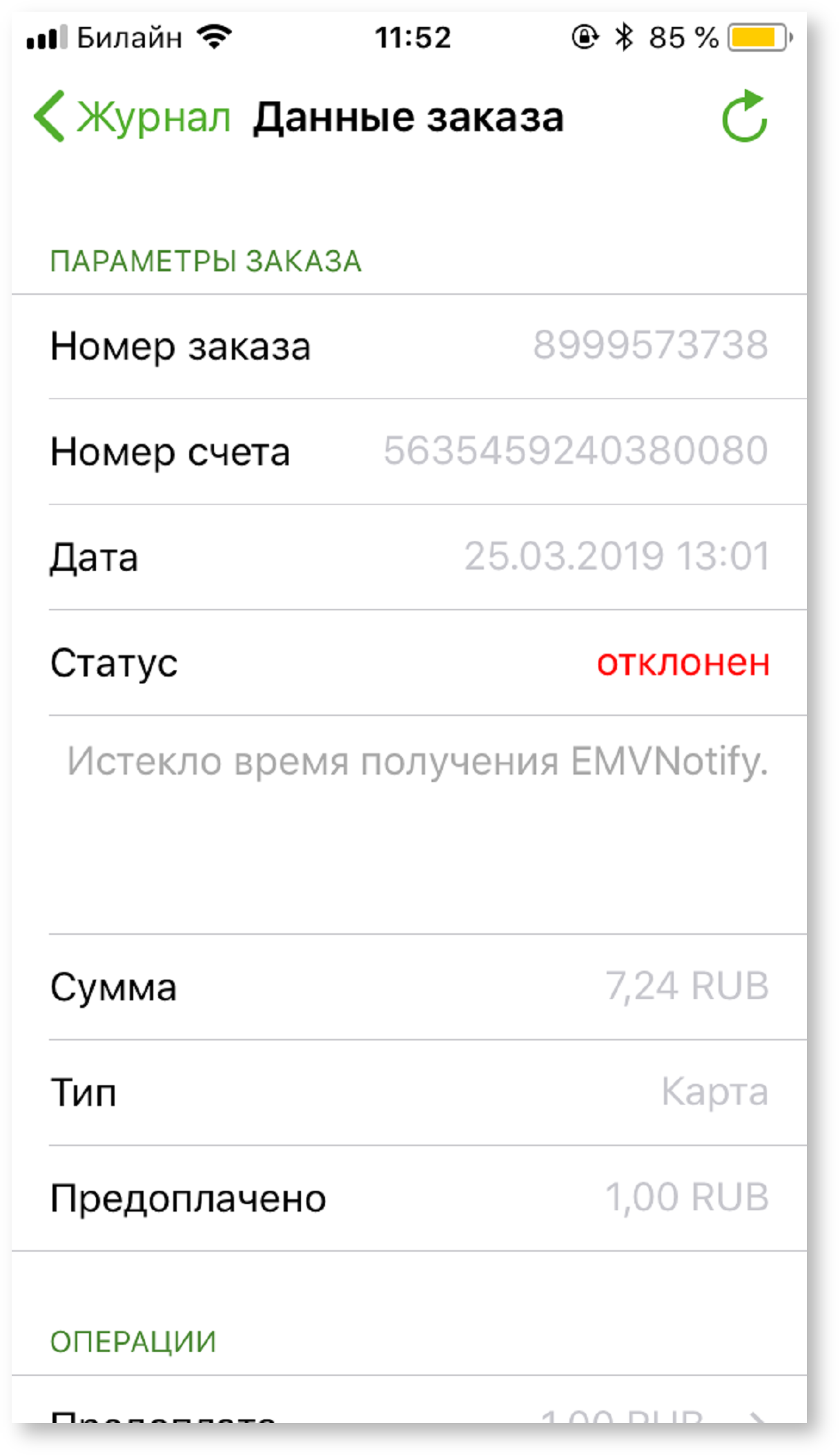 Внешний вид успешной и неуспешной транзакций при детальном просмотре в журнале заказов: