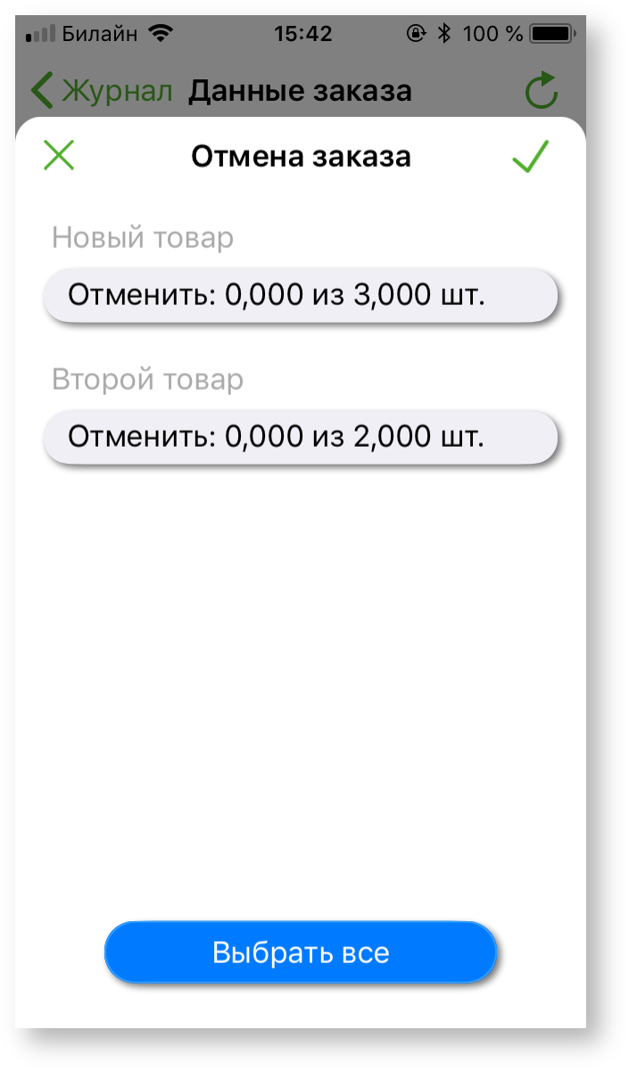 Отмена выбранного заказа осуществляется после нажатия кнопки отмены, расположенной в левой нижней части экрана. Далее пользователю предлагается список позиций заказа для выбора отменяемых позиций. В каждой отменяемой позиции можно указать количество товара для отмены в этой позиции. Для полной отмены заказа можно воспользоваться кнопкой «Выбрать все».