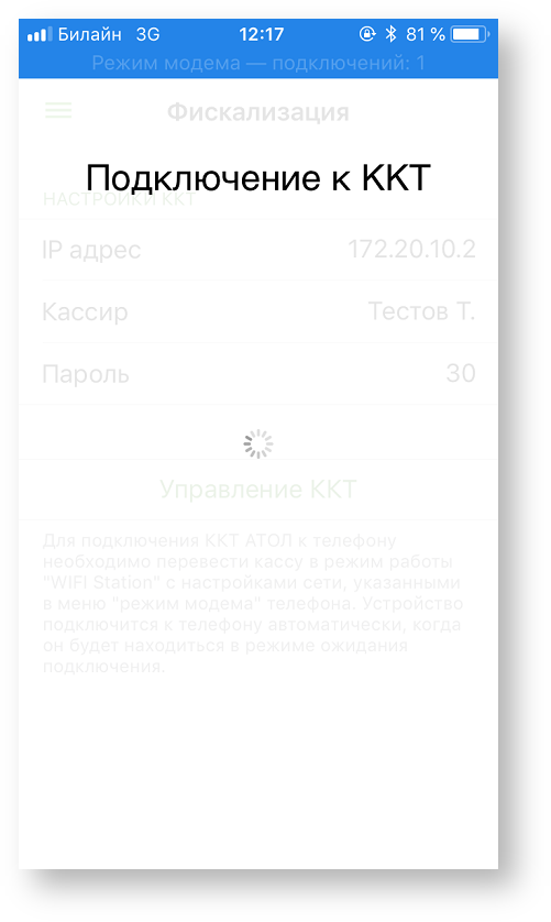 После нажатия кнопки «Управление ККТ» осуществляется подключение.
