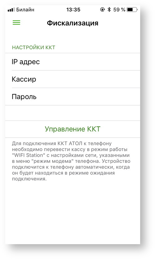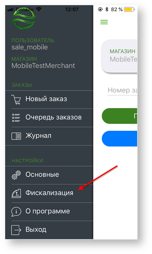 Для приложения под ОС iOS следует выбрать пункт «Фискализация» в слайд-меню левой боковой панели