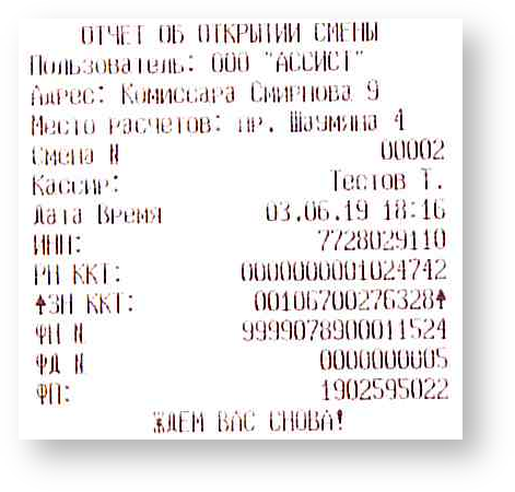 Кнопка «Открыть смену» открывает смену на подключенной ККТ, при этом печатается чек: