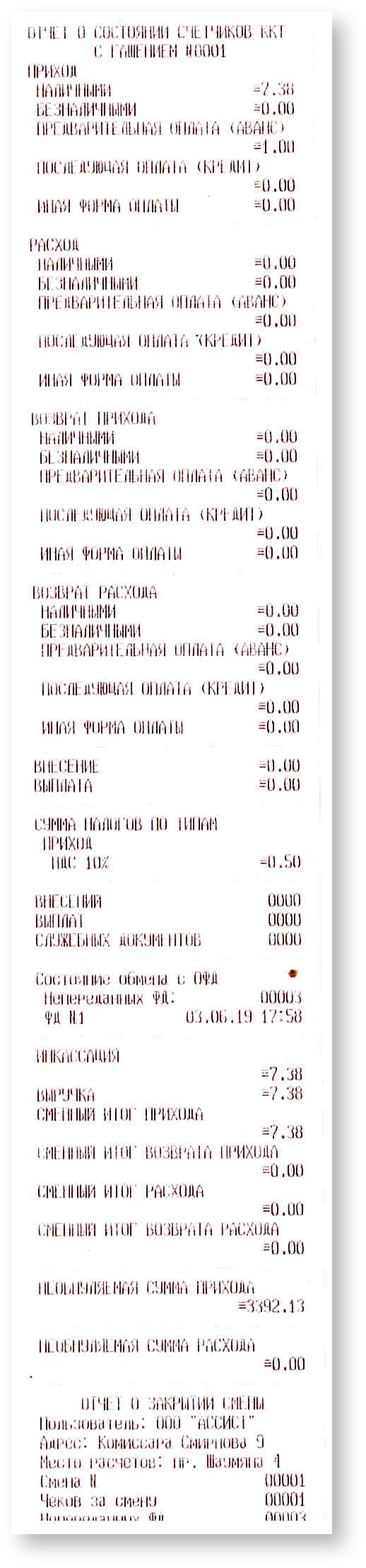 Кнопка «Закрыть смену» закрывает смену на подключенной ККТ, при этом печатается чек: