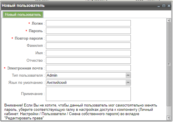 - нажать на кнопку «Новый пользователь» и в появившейся форме создания пользователя ввести все необходимые данные (логин, пароль, повтор пароля, выбрать тип пользователя «USER», выбрать какой язык назначить по умолчанию для создаваемого пользователя, обязательные параметры отмечены звездочками);
