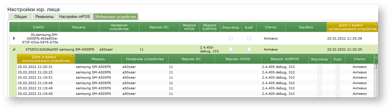Вкладка предназначена для просмотра статусов устройств с установленным приложением SoftPos, зарегистрированных в АПК Ассист. Также здесь можно зарегистрировать новое устройство.