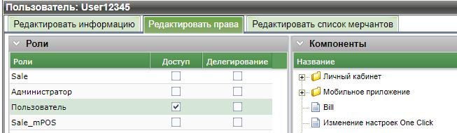 - в открывшемся окне редактирования прав в разделе «Компоненты» в колонке «Доступ» поставить галочки напротив пунктов «Отмены» и «Подтверждения» и/или пункта «Кнопка «экспорт»;