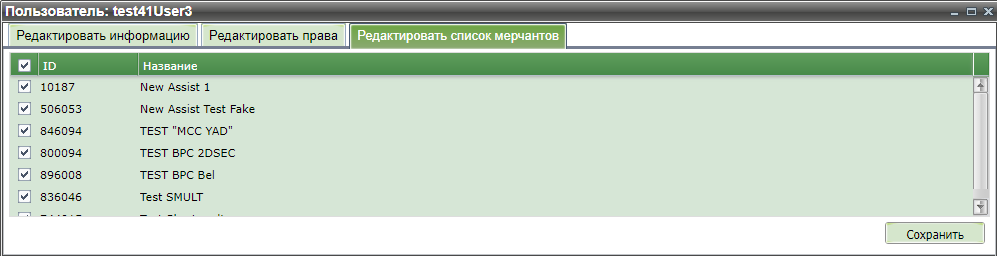 - на вкладке «Редактировать список мерчантов» убедиться, что у пользователя есть доступ ко всем необходимым предприятиям (мерчантам); при необходимости можно убрать доступ пользователя к предприятию (мерчанту) путем снятия галочки напротив соответствующего предприятия (мерчанта); а при необходимости разрешить пользователю доступ к предприятию (мерчанту), нужно проставить галочку напротив соответствующего предприятия (мерчанта);