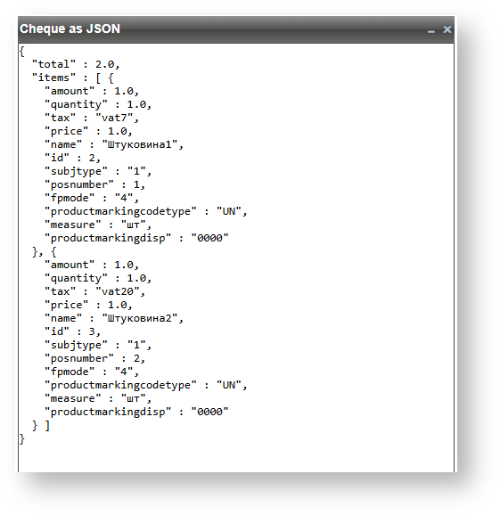 In the item list window, click the Show JSON button to get the current receipt in JSON format.